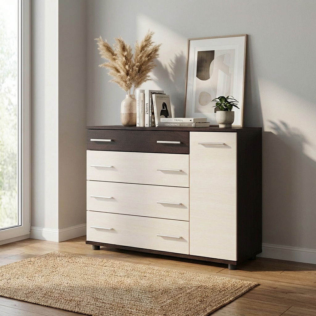 Комод забезпечує зручну організацію зберігання завдяки поєднанню висувних ящиків і закритого відділення. Ящики підходять для білизни та одягу, а секція з дверцятами — для більш габаритних або рідко використовуваних предметів.
