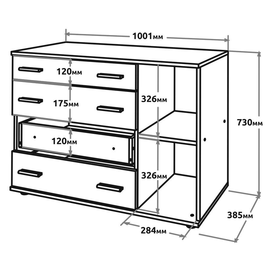 Конструкція комода включає кілька містких висувних ящиків і окреме відділення з розпашними дверцятами, що дозволяє зручно розподіляти зберігання одягу, білизни, аксесуарів, документів та інших побутових речей.