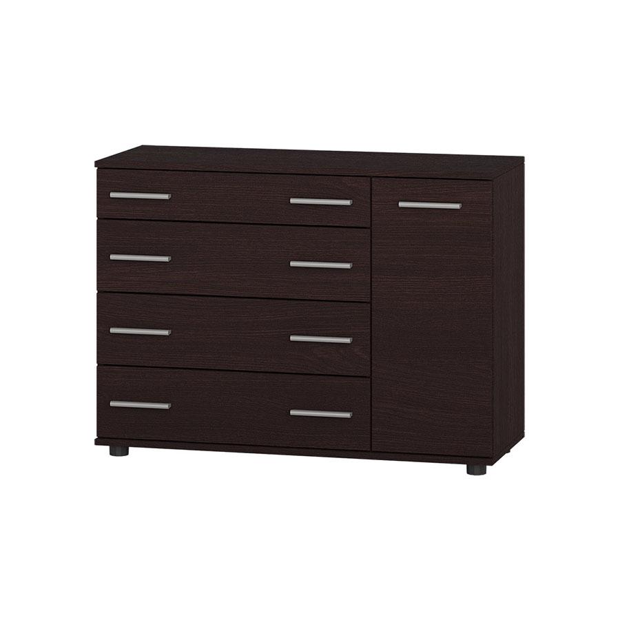 Конструкція комода включає кілька містких висувних ящиків і окреме відділення з розпашними дверцятами, що дозволяє зручно розподіляти зберігання одягу, білизни, аксесуарів, документів та інших побутових речей.