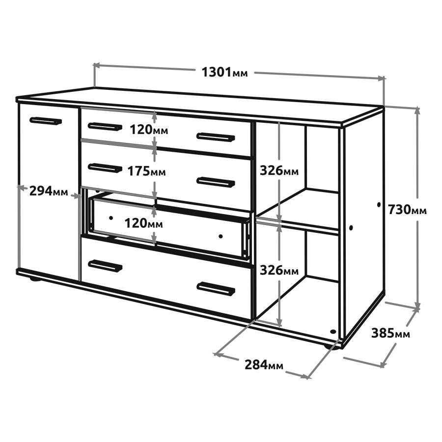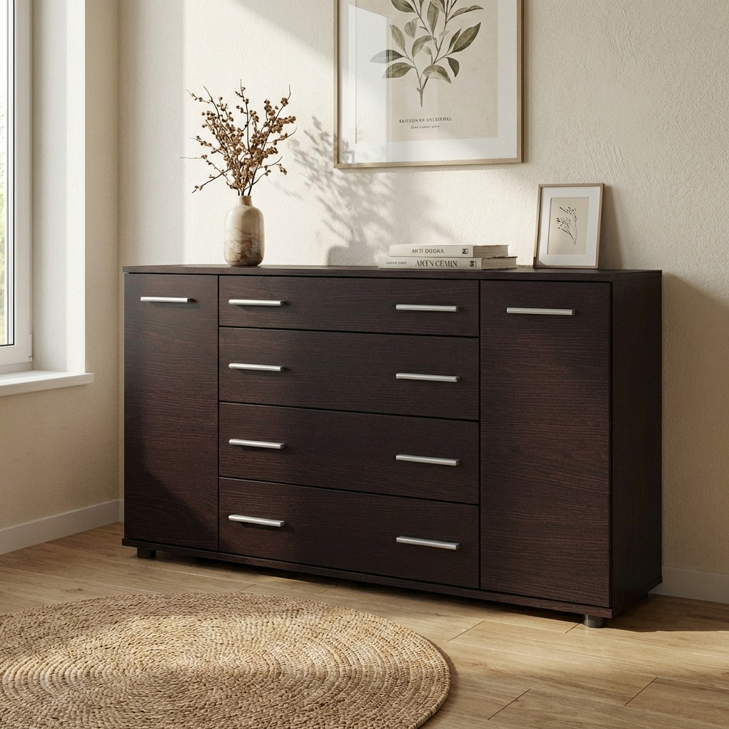 Комод забезпечує зручну організацію зберігання завдяки поєднанню висувних ящиків і закритих бокових відділень. Ящики підходять для білизни та одягу, а секції з дверцятами — для більш габаритних або рідко використовуваних предметів. Верхня поверхня може використовуватися для розміщення декору, дзеркала або повсякденних речей.