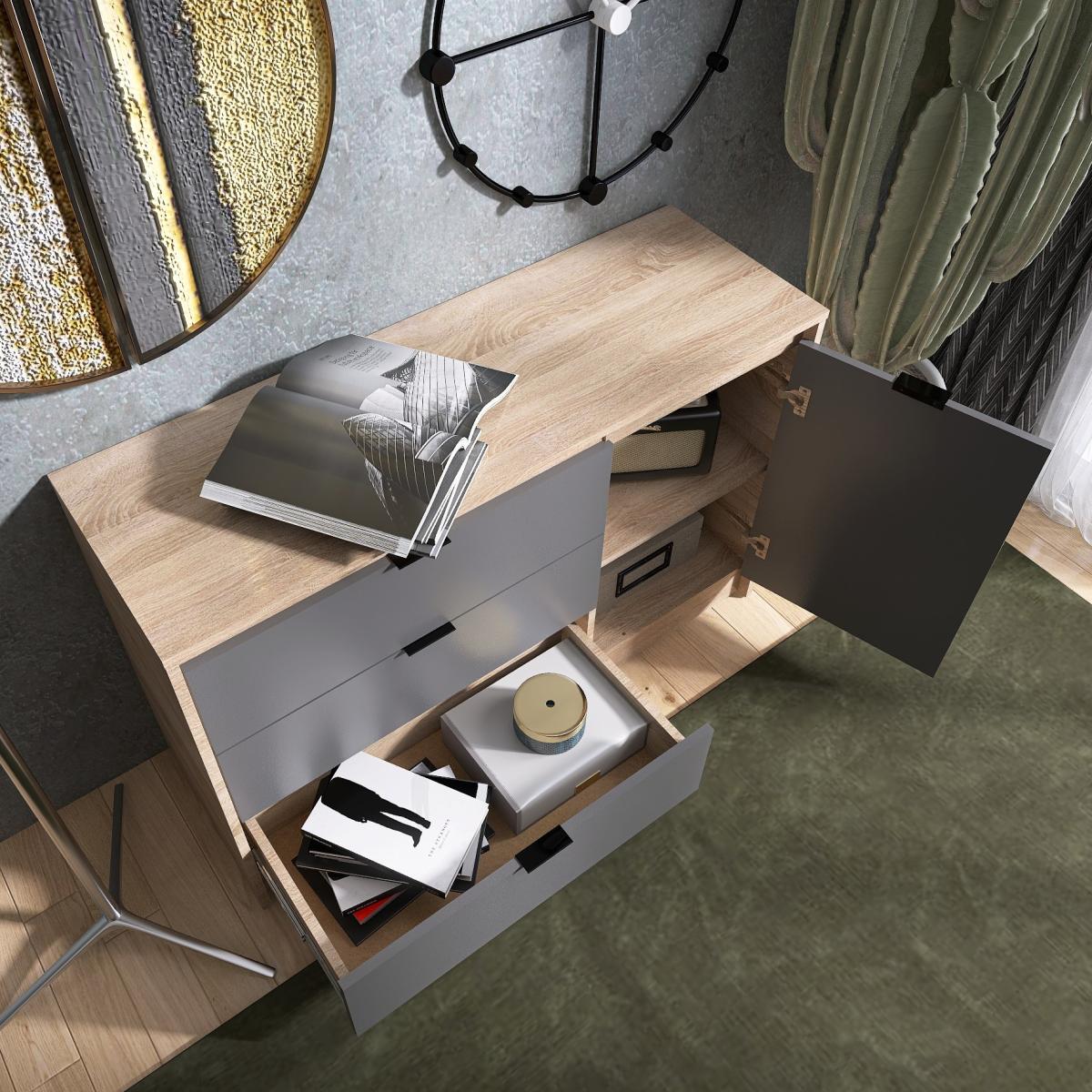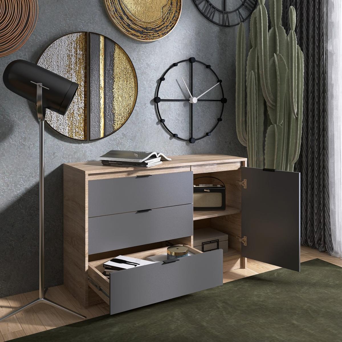Комод EVEREST Сіті — це сучасне й функціональне рішення для зберігання речей у вітальні, спальні або передпокої. Модель виконана у світлому, свіжому поєднанні: корпус у відтінку сонома, фасади — класичного графітного кольору. Комод чудово поєднується з будь-яким інтер’єром — від скандинавського до мінімалізму.