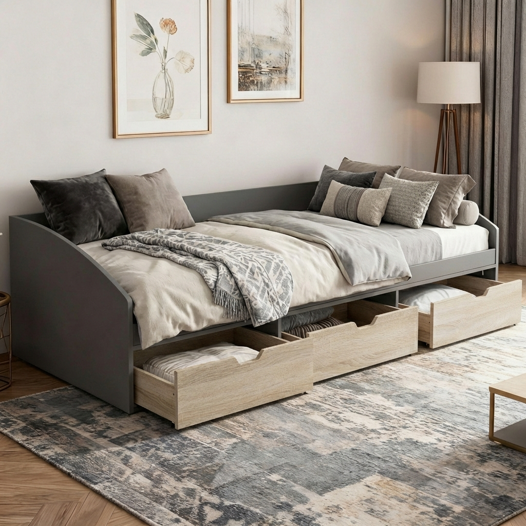 Ліжко оснащене висувними ящиками, що входять у стандартну комплектацію та підходять для зберігання постільної білизни, одягу або інших побутових речей. За потреби ящики можна замовити в інших доступних кольорах.