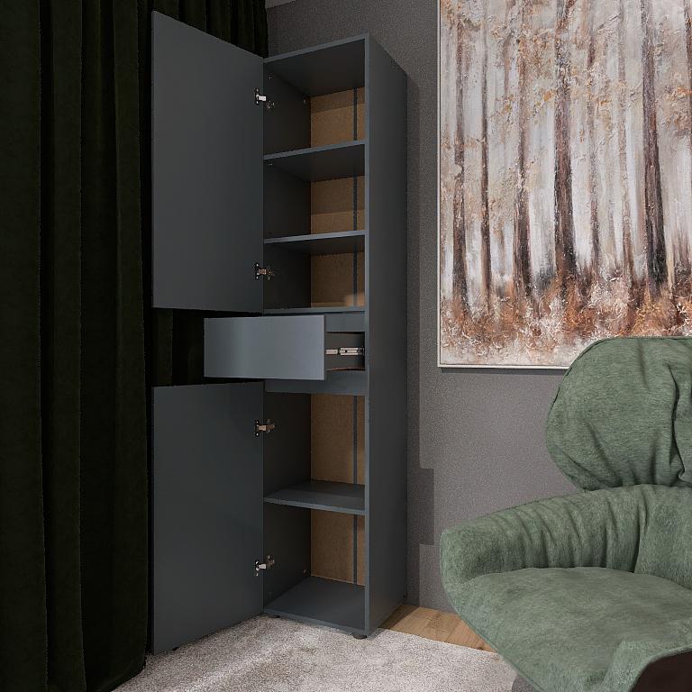 Лайт пенал ПЛ-1 Графіт – це сучасний і зручний елемент меблів, який ідеально впишеться в інтер'єр спальні, вітальні, дитячої кімнати або офісу. Завдяки продуманій конструкції та універсальному дизайну він допомагає ефективно організувати простір, забезпечуючи зручне зберігання речей.