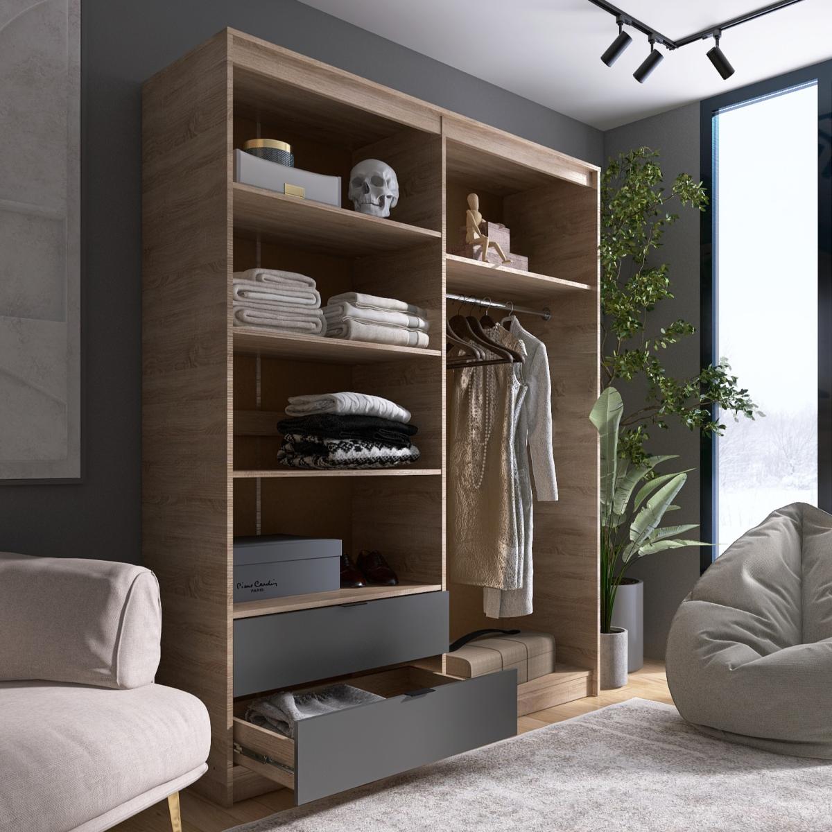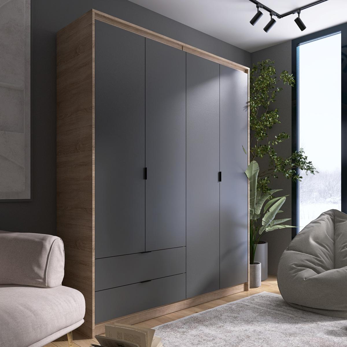 Шафа EVEREST Сіті 1600 — простора та функціональна шафа, створена для зручного зберігання одягу та аксесуарів у спальні, гардеробній або передпокої. Модель виконана у елегантному поєднанні корпусу кольору Сонома та матових фасадів в кольорі графіт, що забезпечує стильний і сучасний вигляд.