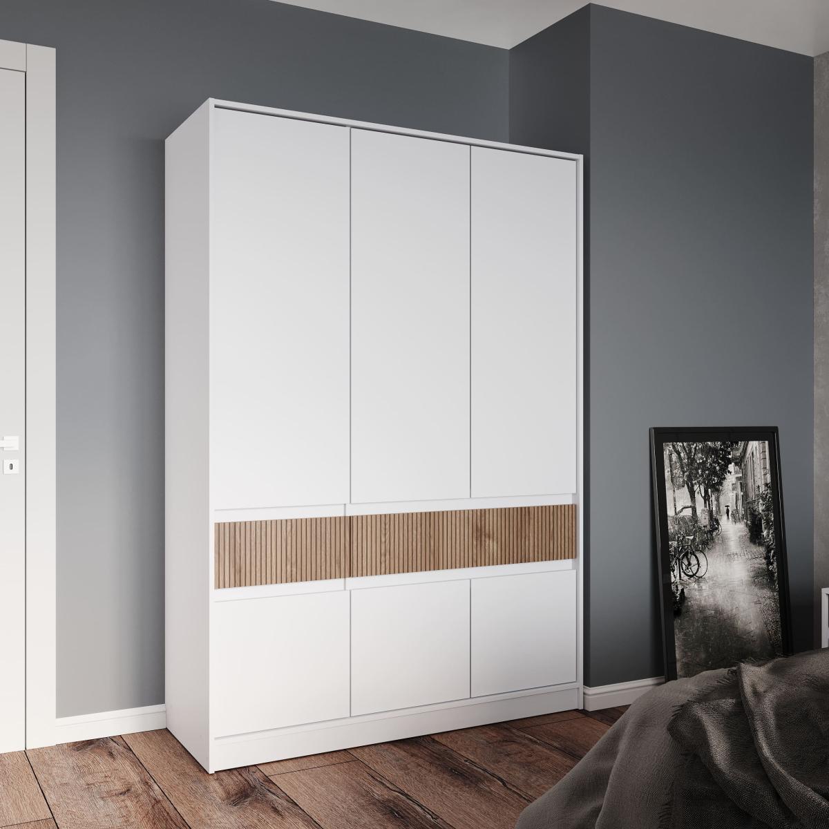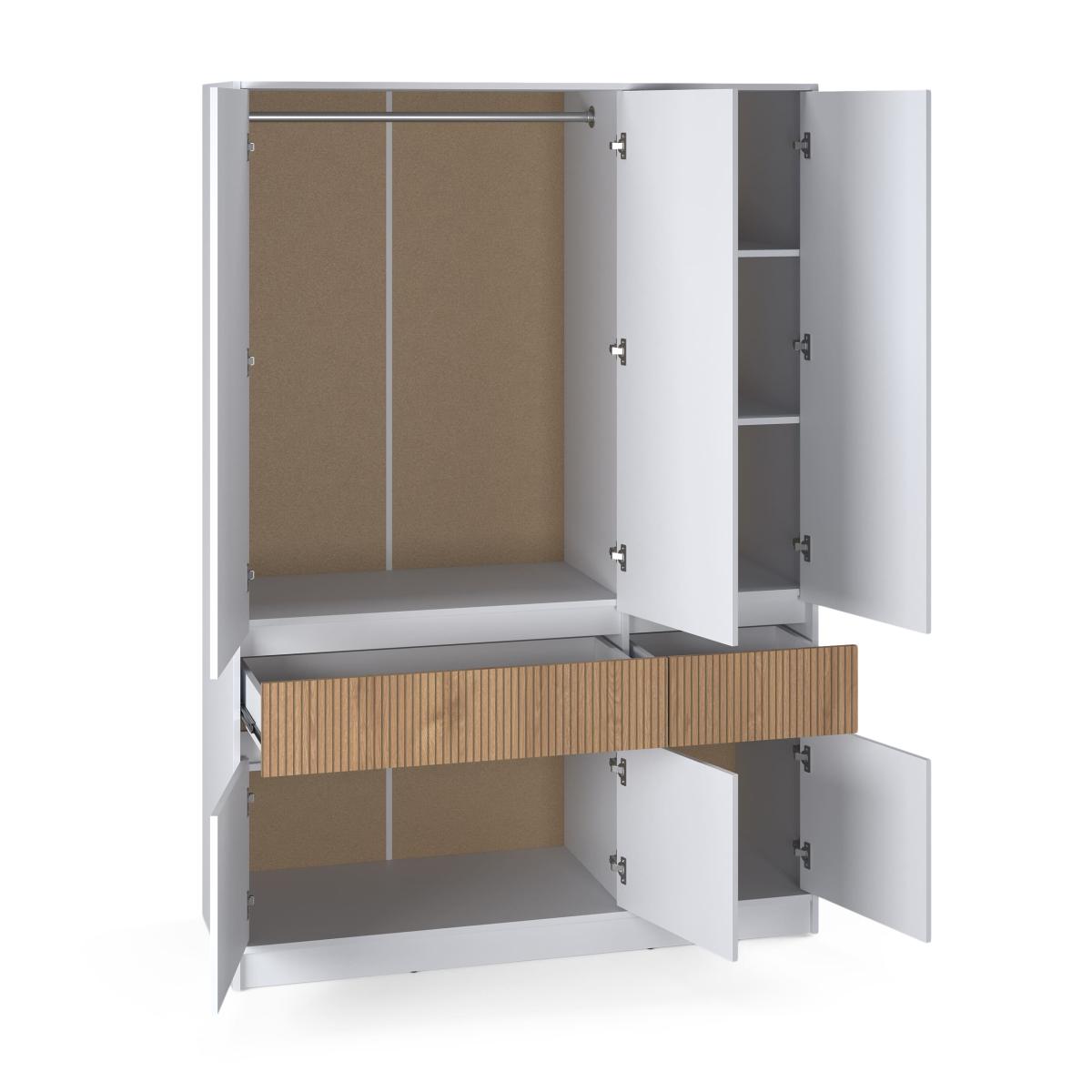 Шафа поділена на секції для максимального комфорту: простора зона зі штангою для довгого одягу та верхньою полицею, відділення з регульованими полицями для взуття й аксесуарів, а також два глибокі висувні ящики для білизни та дрібних речей. Це дозволяє ефективно організувати простір навіть у невеликій кімнаті.