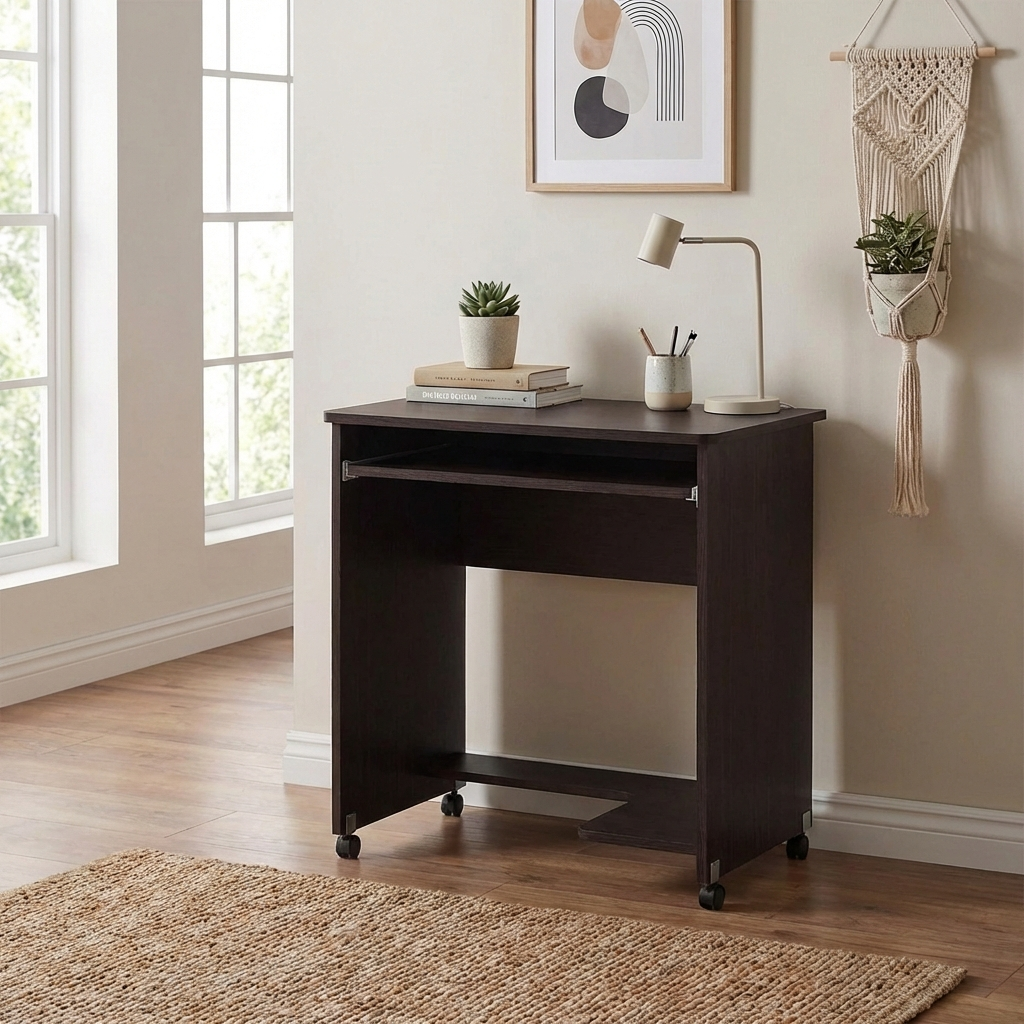 Конструкція передбачає зручну робочу поверхню, висувну полицю для клавіатури або аксесуарів, а також стійку основу на роликових опорах, що забезпечують мобільність і легке переміщення.