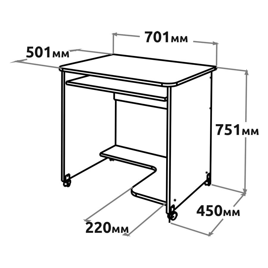 Стіл обладнаний висувною полицею, зручною для розміщення клавіатури, ноутбука або канцелярських дрібниць. Компактні габарити дозволяють використовувати модель навіть у невеликих приміщеннях.