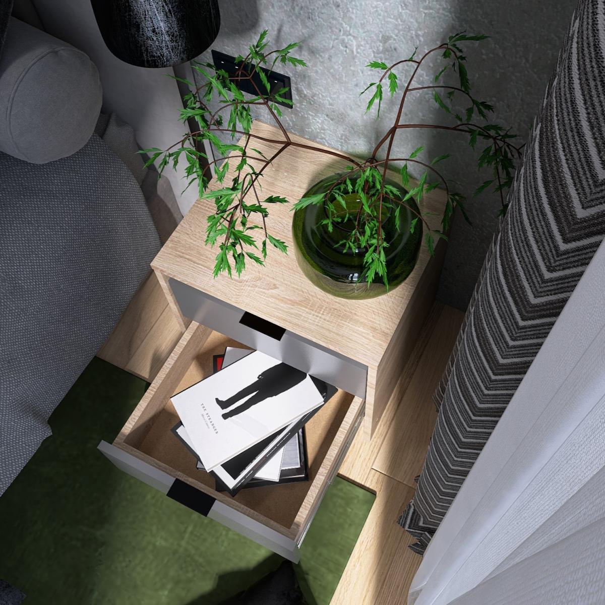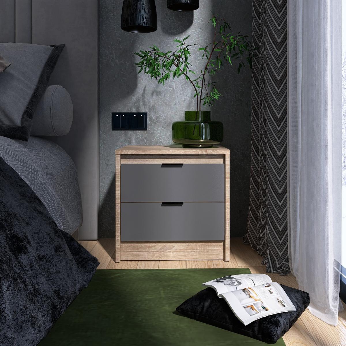 Приліжкова тумба 450 EVEREST Сіті — це компактний та функціональний елемент меблів, який забезпечує зручне зберігання необхідних речей біля ліжка. Сучасний мінімалістичний дизайн у поєднанні кольору корпусу Сонома з фасадами в кольорі графіт створює охайний і стильний акцент в інтер'єрі спальні.