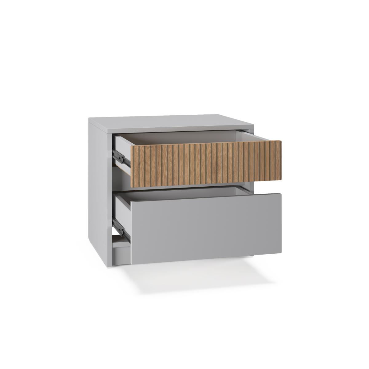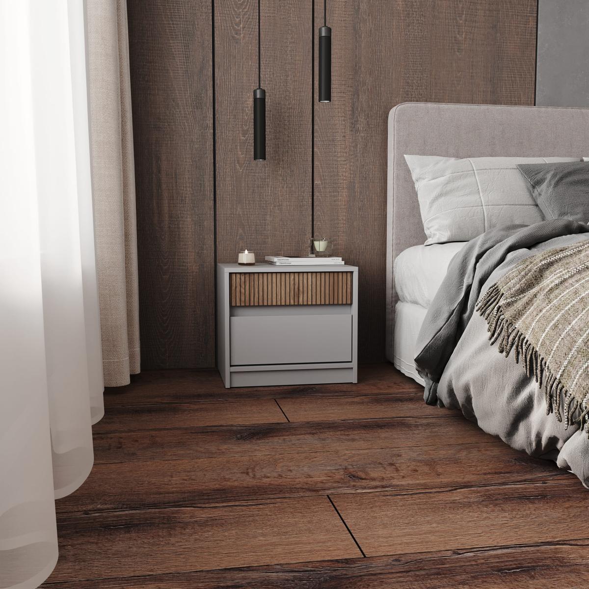 Тумба оснащена двома висувними шухлядами на надійних телескопічних напрямних, що забезпечують плавний і тихий хід. Верхня шухляда (глибина 90 мм) зручна для зберігання аксесуарів, годинників, косметики або особистих речей. Нижня, більш містка шухляда (глибина 180 мм), чудово підходить для книг, журналів, ґаджетів, зарядних пристроїв та інших предметів, які мають бути під рукою.