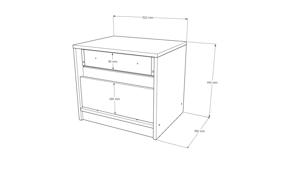 Тумба оснащена двома висувними ящиками на надійних телескопічних напрямних, які забезпечують плавний і безшумний хід. Верхній ящик (глибина 90 мм) зручний для зберігання аксесуарів, годинників, косметики чи особистих речей. Нижній ящик більш місткий (глибина 180 мм) ідеально підходить для книг, журналів, гаджетів, зарядних пристроїв та інших потрібних речей, які мають бути під рукою.
